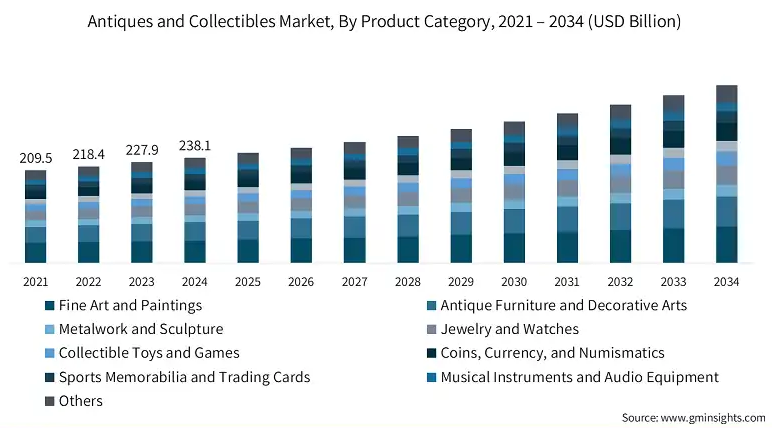 There has been a significant resurgence of interest in antiques, especially among millennials and Gen-Z sellers and buyers. This trend is fueled by an emphasis on sustainability, the pursuit of unique personal style, and the reach of social media and online marketplaces. The global antiques and collectibles market was valued at USD 238.1 billion in 2024 and is projected to grow to USD 402.9 billion by 2034, with a CAGR of 5.5% (Global Market Insights Inc.).